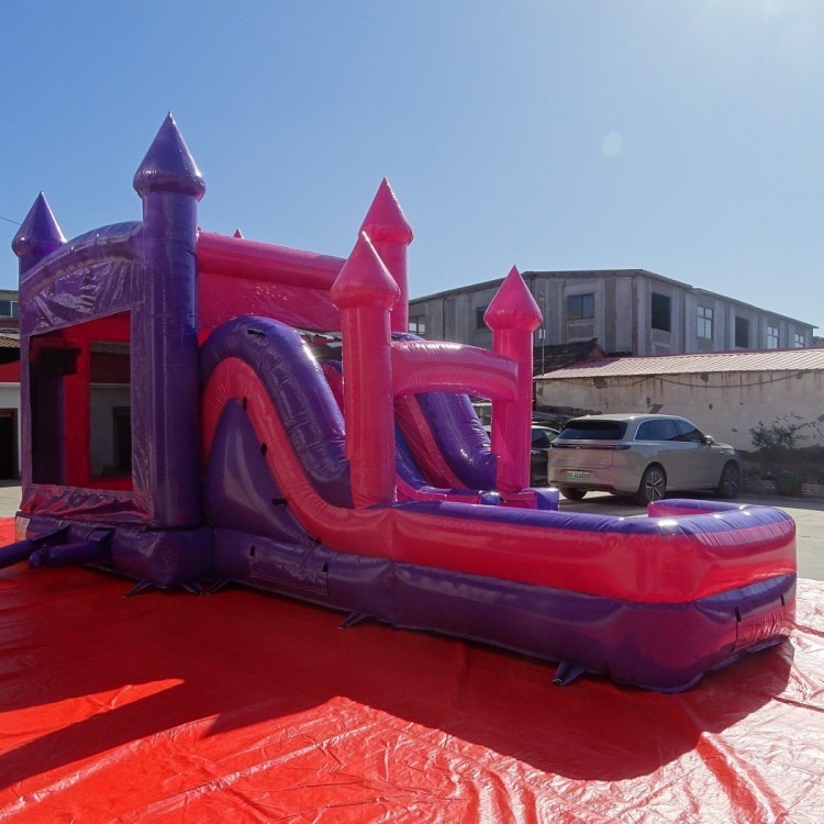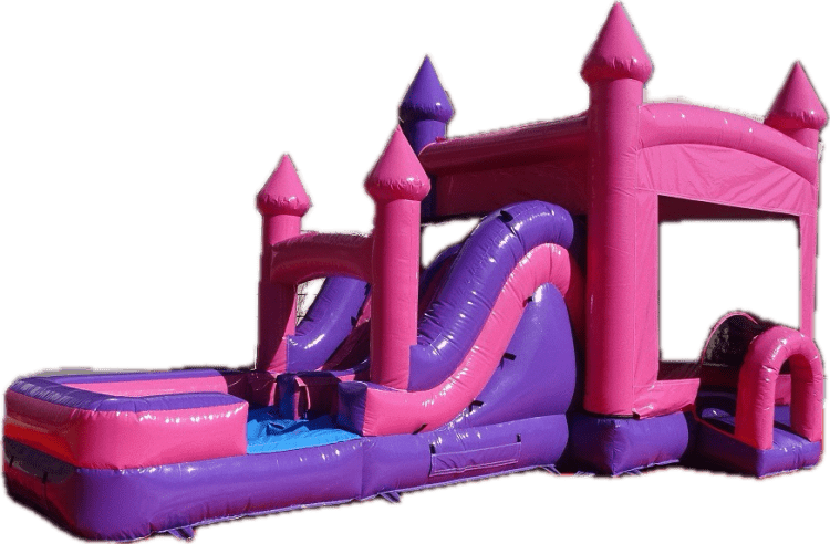 Image Captionpink Combo Dual Lane Wet/Dry! This versatile inflatable combines a bouncy area, basketball hoop, dual slides, and a splash pool for a complete adventure. Whether you're cooling off with the water option or staying dry, it promises  lots of fun