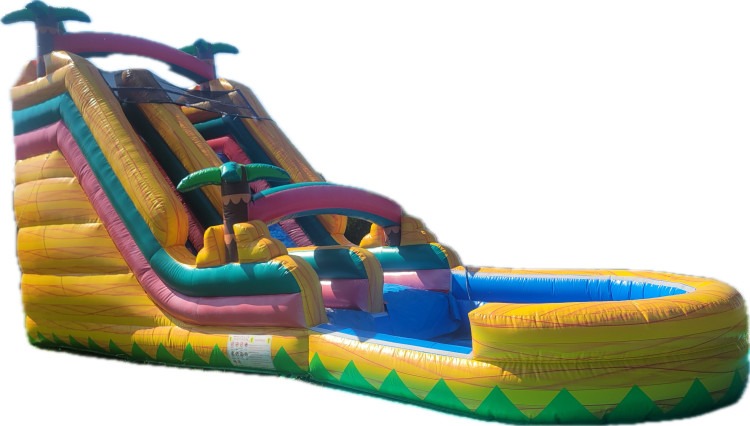 Tropical Yellow Water Slide — Make a splash with this vibrant 26' long x 12' wide x 17' high water slide. Bright tropical colors, palm-tree accents, and dual lanes deliver fast, side-by-side racing down a smooth blue slide into a built-in splash pool. Designed for wet or dry use, it’s an eye-catching centerpiece for backyard parties, summer events, or graduation bashes. Durable vinyl construction, easy ladder climb, and high side walls provide a safe, thrilling ride for kids and teens while the roomy pool at the bottom cushions the landing and keeps everyone cool.