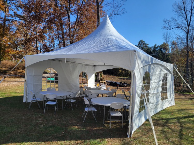 A 20x20 high peak tent creates an elegant, covered gathering space with a dramatic pointed roof that adds height and style to any outdoor event. Designed to shelter guests from sun and light rain, this tent includes full sidewalls with arched window panels that let in natural light while providing wind protection and privacy. The roomy 20 by 20 footprint comfortably fits several round or rectangular tables and chairs for receptions, meals, meetings, or vendor displays.